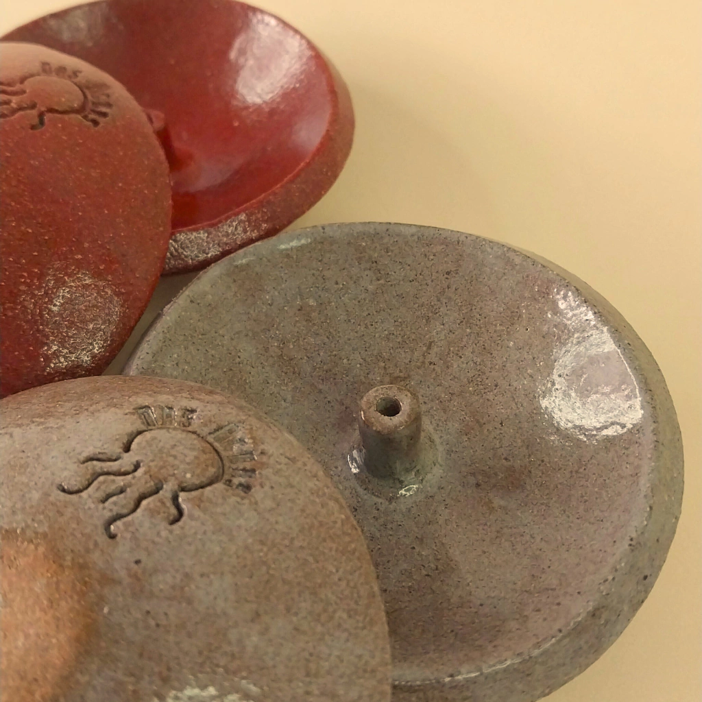 Modelado manualmente em argila, este incensário recebe pintura em engobe e acabamento com esmalte transparente, facilitando a limpeza. Suporte justo para as varetas garantido que as cinzas fiquem contidas no incensário. Perfeito para compor ambientes com beleza e propósito.